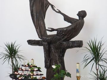 w nowym kościele, w kaplicy bocznej po lewej : przedstawienie Matki Boskiej - w formie rzeźby, podającej rękę potrzebującemu dla uzdrowienia chorego, jest gor (Iwonicz Zdrój)