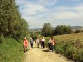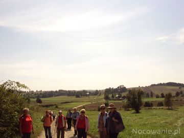 w oddali, przy gościńcu - po prawej, otoczone wieńcem starych drzew - gospodarstwo agroturystyczne, tam przyjęci byliśmy i ugoszczeni przez p. Marysię - na zdjęciu: po prawej, w kapeluszu. W dolinie, śladowo zakrzaczona linia brzegowa potoku Leluta - w m. Humniska wody rzeki Stopnica zasili. A ks. Jan Twardowski pisał: "to, że nie wiesz dokąd iść, sama cię droga poprowadzi" - jakoś do tego miejsca i widoku mi pasuje...