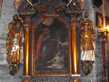 w ołtarzu bocznym po lewej w polu głównym: obraz św. Stanisława bpa wskrzeszającego Piotrowina z 2 ćwierci XVIII wieku. Po bokach - po lewej w obramieniu z winnej latorośli nieokreślony święty, po prawej św. Wawrzyniec, w zwieńczeniu dwa anioły z girlandami i św. Michał Archanioł /zapraszam do galerii m. Sanok - tam opis w temacie/.