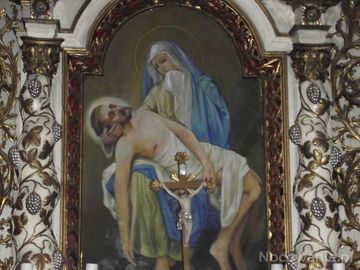 w ołtarzu głównym: obraz Matki Boskiej Bolesnej - Pieta, z kręconymi kolumnami, o bogatej dekoracji snycerskiej z bujnego akantu - pochodzi z cerkwi w Uluczu.