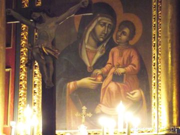 w ołtarzu głównym: obraz Matki Boskiej w typie Hodegetrii z Dzieciątkiem podającym jabłko Marii. Przed ołtarzem Chrystus na krzyżu - przypominam, że jesteśmy w (Średnia Wieś)
