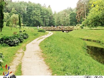 ✎.....osią parku(↾≀↿♤↟↟↟♧) jest meandrująca łagodnie rzeka (≀) Wogra ,przy której znajduje się grobla spacerowa. Rzeka(≀) dzięki niewielkim spiętrzeniom łączy dwa stawy-północny zwany stawem Wedlów i południowy stawem Manteufflów. Grobla(≂) jest idealną trasą spacerową dla turystów i kuracjuszy. Drewniane mostki(≁) i altany(⧂) nadają tej części parku(♤↟↟↟♧) romantyczno-sentymentalny charakter. Sam spacerowałem w tym miejscu, ostatnio latem w roku 1970,kiedy uczyłem się w szkole zawodowej w Połczynie Zdroju. A tą groblą dochodziło się do basenu miejskiego.Wtedy ta dróżka nie była tak urokliwa jak ją teraz postrzegam /a może to właśnie,..sentymentalne ❤️️️wspomnienia z lat młodzieńczych/ ...