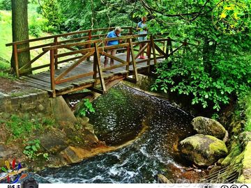 ✎.. przejście przez rz.Wogrę do jej kaskady(┈∾┄) ...to już ostatni drewniany mostek≏ w parku(♤↟↟↟♧) za nim miasto Połczyn - Zdrój...