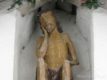 w płycinie kapliczki, nad wejściem: figurka /rzeźba ludowa/ Chrystusa Frasobliwego, którego wizerunek kojarzy się głównie z biedą otoczenia, ale jednocześnie z (Lalin)