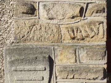 w portalu: herb Korczak - w oryginale byłoby: w polu czerwonym trzy wręby srebrne w pas, zwężające się w dół. Herb ma pochodzenie węgierskie, trzy wręby oznaczają trzy rzeki : Dunaj, Cisę /lub Drawę/ i Sawę. Wyżej: zagadkowe znaki kamienne z resztek zamku pobranych dla potrzeb tworzenia przekazu.