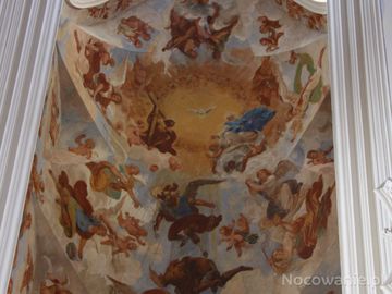 w prezbiterium powyżej na sklepieniu : Adorację Trójcy Świętej przez anioły z personifikacjami czterech stron świata. (Krzeszów)