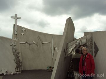 w sąsiedztwie kościoła ale bliżej cmentarza są błonia pielgrzymkowe - tam pomnik o wymowie tragicznie i nagle kończącego się życia - ofiary komunikacyjne, zostali zabici, utonęli, wypadki lotnicze, szybowcowe, paralotni, balonowe. Na murach pomnika cegiełki wotywne ze wspomnieniem ofiar. Po wejściu do kościoła - na prawo jest kaplica - tam rodziny ofiar modlą się o pokój duszy ich bliskich.