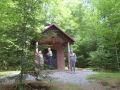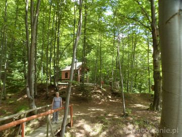 w siodle zbocza górskiego spływa potok, nad nim kładka, dalej ścieżka do leśnej kaplicy - tam obraz z Matką Boską - orędowniczką i wspomożycielką wiernych.