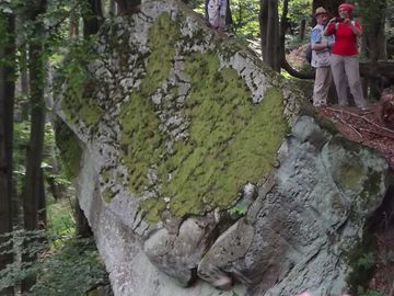 w zalesionym Masywie Kamienia - na jego skłonie spotyka się skały podobne do grzyba, muszli, czaszki a nawet wielki kamień z naturalnymi oknami i mur zbudowany z ogromnych głazów.