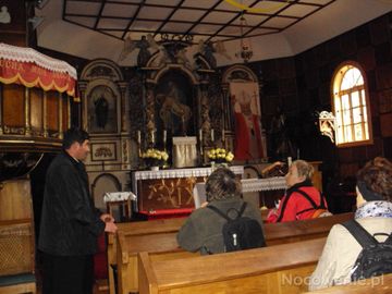 we wnętrzu świątyni - z księdzem proboszczem - opowiada, przybliża, wyjaśnia - przy okazji: dziękujemy. Proponuję ponadto zwrócić uwagę - a wtedy i podziwiać : feretrony - pochodzące też z innych, dziś już nieistniejących świątyń - cerkwi w Uluczu i Krzywem - ambona - są ustawione po lewej poniżej ambony no i czekają by ubogacić / uświetnić kościelne msze z procesjami.