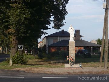 We wsi przy drodze nr 11 figura Serca Pana Jezusa i w tle droga do wsi