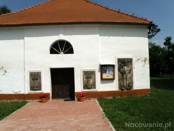 Wejście do kościoła /epitafia w czasie przebudowy z wnętrza przeniesiono na ściany zewnętrzne/ (Jurcz)