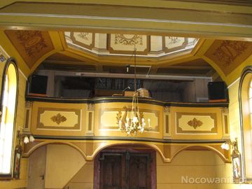 wewnątrz świątyni - nawa na rzucie kwadratu, widok na babiniec oraz chór - pięknie zdobiony - i organy, stare, zakupione z Grabówki w 1979r.