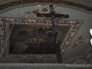 wewnątrz świątyni : stropy płaskie, ściana tęczowa zamknięta łukiem półkoliistym z belką tęczową, na której barokowy krucyfiks.