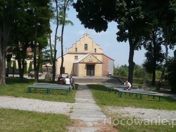 Widok na kościół i budynek klasztorny ojców Pasjonistów z ołtarza na Golgocie. (Sadowie)