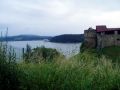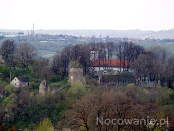 Widok na Wzgórze Zamkowe (Stare Miasto) od strony ZSR. W tle za ruinami murów kościół. (Dobczyce)