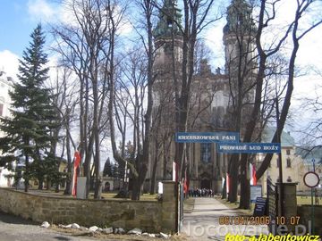 Widok placu kościelnego, który przypomina park. Aleja na wprost bramy głównej prowadzi do głównego wejścia Bazyliki (portal główny). (Krzeszów)