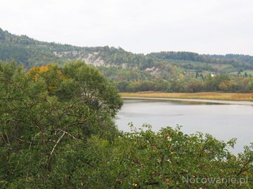 widok z drogi przez Zabrodzie : tu już wstępna tafla wód Zalewu Myczkowieckiego - a kiedyś był tu po prostu San i jego zazwyczaj w tym miejscu płytkie wody pozwalały przekroczyć go w bród - toteż : Zabrodzie. Dalej widać kamieniołom na Wzgórzu Koziniec - 527m npm, tam pozyskiwano budulec na potrzeby budowanej zapory w Solinie. Tam dziś szlak i tarasy widokowe.