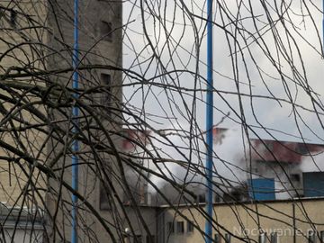 Widok z okien Urzędu Miasta na zakład płyt, Steico. Te białe obłoki wydostające się z kominów, to para wodna, główny mechanizm napedzający produkcję. (Czarna Woda)