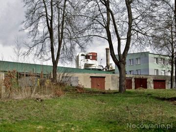 Widok z placu zabaw na fragment zakładu płyt pilśniowych "Steico"
