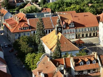 Widok z wieży kościoła na klasyczny ratusz z XIX wieku znajdujący się w centrum Rynku na Starym Mieście.2011-08-05
