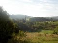Widok ze wzgórz okalających dolinę. Na horyzoncie Kraina Wygasłych Wulkanów ze słynną Ostrzycą. (Płóczki Górne)