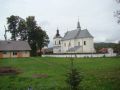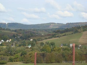 widok ze wzgórza Lachawa, w dolinie w zadrzewieniu pomnik przyrody "Wodospad na rzece Olszance". (Uherce Mineralne)