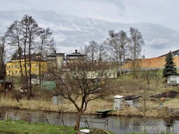 Widok zza rzeki Wdy na zakład Steico i bloki przy ulicy Mickiewicza (Czarna Woda)