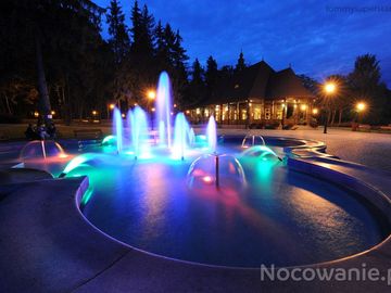 Wieczorny pokaz iluminacji przy fontannie w Parku Zdrojowym w Wysowej Zdrój.