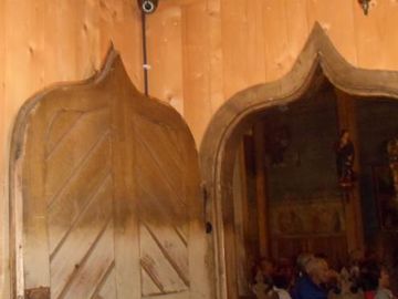 wieś stanowiła w XIVw. własność rycerską możnego w południowej Polsce rodu Pieniążków herbu Odrowąż i to oni byli fundatorami tego kościółka. Przy budowie zatrudnili brygadę zawodowych, sprawdzonych cieśli - posługiwano się jedynie siekierami i nie używano gwoździ. N/z późnogotycki portal o wykroju w tzw. "ośli grzbiet", widzimy też fragment kasetonowego stropu.