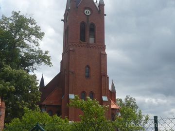 Wieża kościoła widziana od strony rzeki.  (Pogorzelica)
