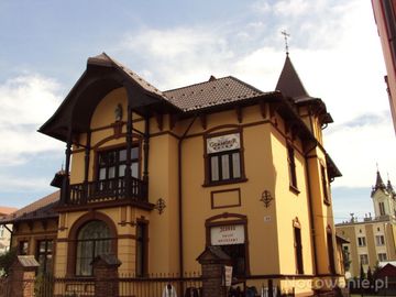 willa dra Stanisława Domańskiego, warto wiedzieć o obiektach sanatoryjnych przy dzisiejszej ul. Gajowej, należących do dra, leczono tam choroby z zakresu ginekologii i położnictwa. Po prawej : wieże kościoła farnego.