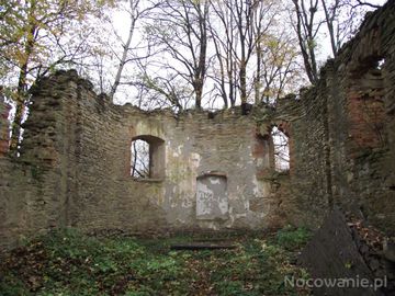 wnętrze cerkwi, opuszczonej, w ruinie. Murowana z kamienia, pierwotnie potynkowana, jednoprzestrzenna - na rzucie prostokąta, wewnątrz zamknięta półkoliście. Pod cerkwią krypta z grobami fundatora i jego synów.