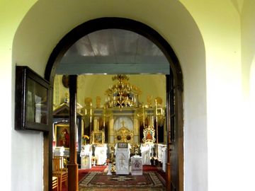 Wnętrze cerkwi widziane przez otwarte drzwi, ale zamkniętą kratę. (Bończa)