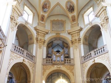 wnętrze świątyni - widok z nawy na prospekt organowy i chór. (Wambierzyce)