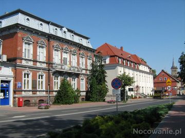 Wolsztyn, ul. 5 Stycznia, budynek Poczty oraz Starostwo Powiatowe.