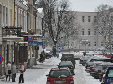 Wolsztyn, ul. Kościelna w głębi Rynek i budynek Urzędu Miasta i Gminy.