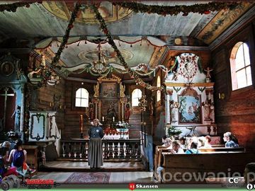 ⚐..Kaszubski Park Etnograficzny im.Teodory i Izydora Gulgowskich - Wdzydze Kiszewskie. Kościół św. Barbary ze wsi Swornegacie w j.kaszubskim Swòrnégace lub też Swòrnigace. ✍....Ogólny wygląd wewnętrzny kościoła ,jak widać jest jednonawowym z prostokątną nawą,mierzoną w staropolskich stopach a opiekun tego obiektu w skansenie przedstawia historię świątyni uczestnikom młodzieżowej wycieczki .Chór świątyni zdobią niewielkie organy gabinetowe wykonane przez gdańskiego organmistrza – Gottfrida Weinerta w 1765 r. .Pomimo mojej prośby nie pozwolono mi wejść na chór i obejrzeć owe organy ☹... zdj.2