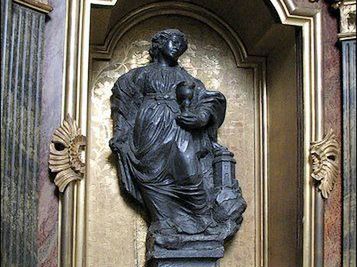 XVII wieczny posąg patronki górników św. Barbary. Wykonano go z rzadko spotykanej wielkości samorodka galeny - rudy ołowiu (PbS). (Kielce)