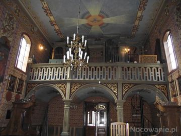 z nawy głównej widok na strop / sklepienie i polichromię sufitową oraz chór z organami, boazerią zdobiącą parapet i arkadowe wsporniki oraz spiralne schody, wid (Humniska)