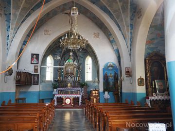 z nawy na ołtarz główny, ambona, fragment sklepień i polichromii ściennej i sufitowej. Zachowały się starsze od tej świątyni zabytkowe elementy wyposażenia: późnobarokowy ołtarz boczny z obrazem Matki Boskiej z Dzieciątkiem, malowanym na desce, XVIIIw. w srebrnej sukience, chrzcielnica z przełomu XVIII i XIXw. oraz klasycystyczny feretron.