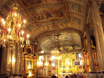 z nawy na ołtarz główny, zwraca uwagę bogata polichromia sufitowa z końca XIX wieku autorstwa Pawła i Jana Bogdańskich.