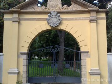 Zabytkowa barokowa brama wjazdowa, murowana z cegły, z przejazdem w formie arkady flankowanej przez pilastry toksańskie, z naczółkiem trójkątnym, przerywanym z monogramem Eleonory Charlotte, księżnej oleśnicko-witemberskiej; poniżej kartusz herbowy dawnych właścicieli.