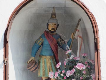 zabytkowa kapliczka przydrożna - wewnątrz za oszklonymi drzwiczkami stoi ludowa figura św. Floriana.