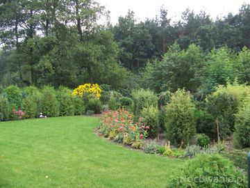 Zadbane rabaty kwiatowe i dzika natura lasu
