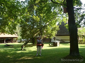 Zagroda - Muzeum, zrębowa studnia z żurawiem, dalej po lewej kierat - tu koło napędowe mechanizm uruchamiany ruchem okrężnym konia zaprzęgniętego do widocznego tu dyszla, dalej wozówka a w niej nieduży, drewniany wóz tzw. leterkowy bo miał letry /czasem zwane lotry/ i ściana boczna Chałupy Kmieca, na drzewie zawieszona budka lęgowa.