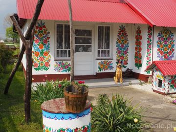 zagroda, obejście gospodarskie - zdobione kwieciście, barwnie, wzorcowo. (Zalipie)