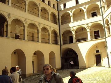 Zamek w Pieskowej Skale, zwany "Perłą Jury", z ekspozycją muzealną Oddziału Państwowych Zbiorów Sztuki na Wawelu, widoczne krużganki z końca XVIw. Należy też p (Pieskowa Skała)