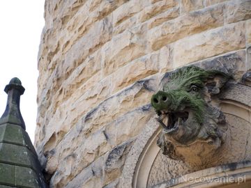 zamek wzbogacony fortyfikacyjnymi basztami, ta zawierała komnaty myśliwskie toteż jej fronton zdobią symbole / trofea łowów. (Moszna)