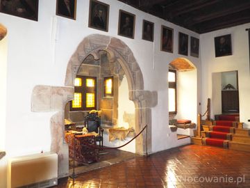 zamkowe wnętrza - tu Sala Rycerska, pod stropem portrety sarmackie, m.in. rodu Sapiehów, Zboińskich, Czartoryskich, Ewarysta Andrzeja Kuropatnickiego - wybitnej osobowości oświecenia. Tu w sali podejmowano gości, urządzano uczty i zabawy - to tymi schodami wchodziła zapewne pani Anna Wesselinowa - i jak piszą : "ochotna a strojna ruszała w tan rozbawiona".